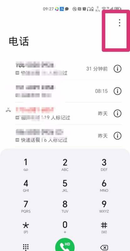 打開通話記錄界面:在手機主界面找到“通話”或“電話”應用,點擊進入通話記錄頁面,點擊右上角的三個點。