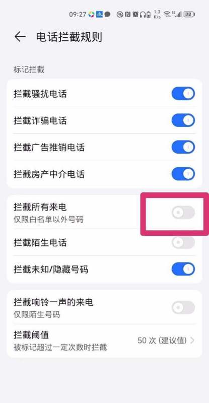 開啟攔截所有來電:將“攔截所有來電”選項的藍色開關滑動至開啟狀態,此時手機將自動拒接所有來電,但不影響移動數據網絡使用。