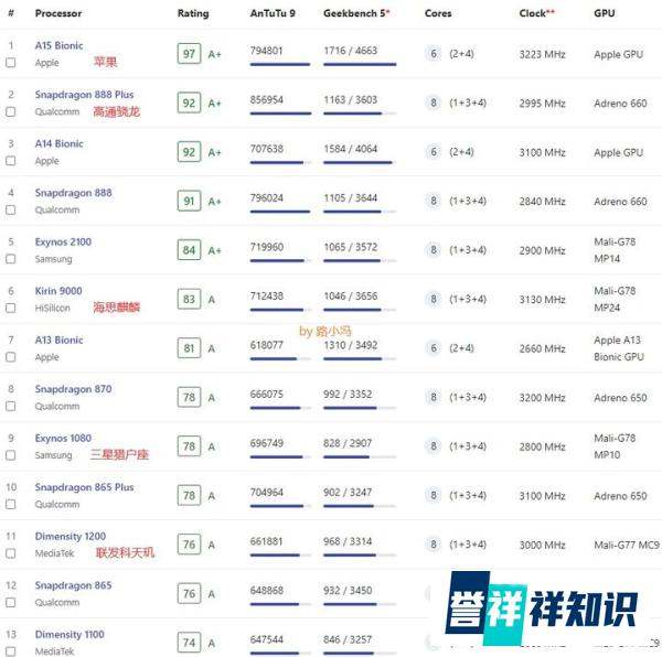 性能排行:A15(iPhone 13系列)>驍龍888/888 Plus>驍龍870。