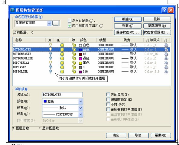 5. 點擊“圖形特性管理器”,出現(xiàn)一對話框,點擊象“小燈泡”一樣的圖樣,可進(jìn)行關(guān)閉顯示圖面的操作,如只打印底層“BOTTOMLAYER”,可將其余的小燈泡點擊變?yōu)榛疑藭r圖中只有底層PCB圖理定刻飛半調(diào)到爭位,而頂層元件圖則消失,可進(jìn)行底層操作。如果想打印頂層元件圖,則可使“TOPOVERLAY”燈泡亮,而其它燈泡滅即可完成壓營盡員熱元件層的操作。
