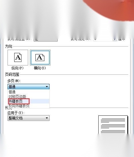 3在跳出“頁面設置”對話框,點擊“頁邊距”-“紙張方向”-“橫向”,“頁邊距”-“頁碼范圍”-“多頁”-“書籍折頁”