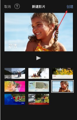 4、之后會進入“新建影片”頁面,在這里可以選擇視頻的風格。比如我喜歡簡潔型的,就選中簡潔風格的視頻類型,然后點擊右上角的“創建”按鍵。