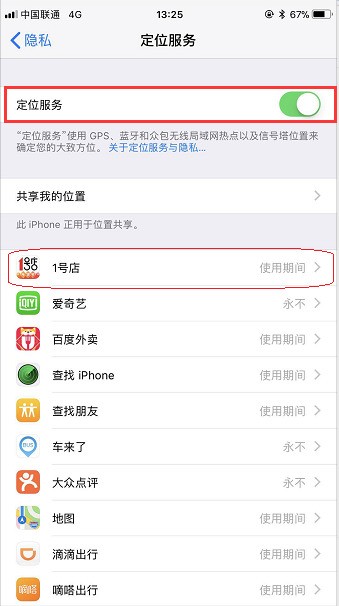 四、進(jìn)入以后將“定悄爛位服務(wù)”一項(xiàng)的開(kāi)關(guān)關(guān)閉,如下圖所示,這樣就關(guān)閉了GPS定位。