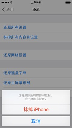 2、接著進(jìn)設(shè)置→通用→還原,點(diǎn)抹掉所有內(nèi)容和設(shè)置,等于給手機(jī)來個(gè)重啟清空,別怕,數(shù)據(jù)一會(huì)兒就回來!