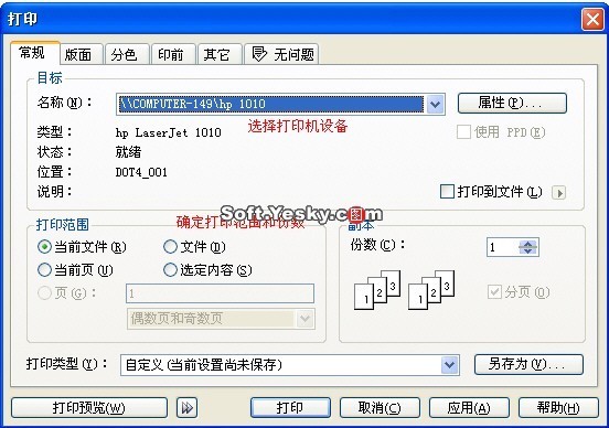 首先設置打印機,本文中以HP1010為例(最大可打印幅面為A4)。在這里羅嗦幾句:可以選擇本地打印機,也可是網絡打印機,不過要確保正確安裝并能使用。
