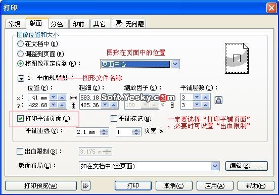 看看“打印平鋪頁面”上面一些文本框的含義: