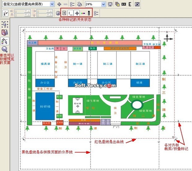 在圖5中我們可以清楚的看到,圖形文件被分成了3×3個A4頁面,黑色虛線是格A4頁面的分界線,整個打印范圍四周是平鋪對齊標記和裁剪折疊標記,紅色虛線是出血位,