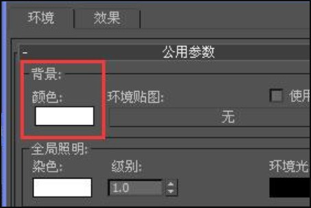 6、點擊上面渲染效果圖紅框所示按鈕,打開“批木環境和效果”設置面板,將“環境”后顏色由黑色修改為純白。