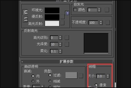 4、找到材質編輯器面板中的“擴展參數”選項卡,里面可以設置線框的粗細。具體數值根據最后渲染的結果自行調整。