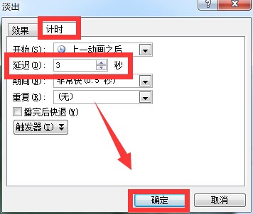 在彈出的對話框中選擇“計時”,在“開始”一欄選擇“與上一動畫同時”或者“上一動畫之后”,在“延遲”一欄中輸入圖片要停留的時間,然后點擊“確定”,這樣圖片就會停留一段時間再消失了。