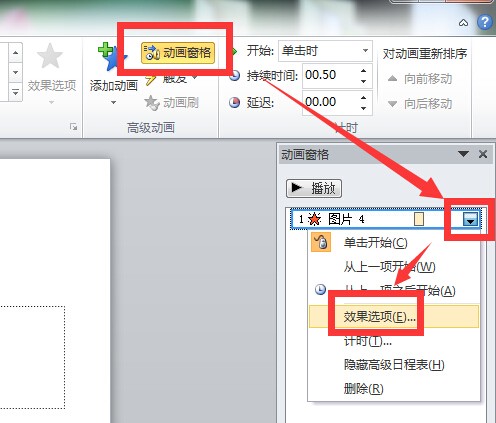 點擊“動畫窗格”,然后在右側點開圖片動畫的下拉菜單,選擇“效果選項”;