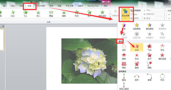 打開ppt2010,選中要加效果的圖片,點擊“動畫”下面的“添加動畫”,在下拉菜單中找到“退出”一欄,選擇一種退出方式;