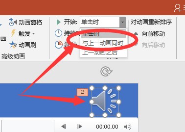 4、接著繼續選中音頻,圖片在動作效果里面,將它選擇為與上一動畫同時,這樣就設置成功了。
