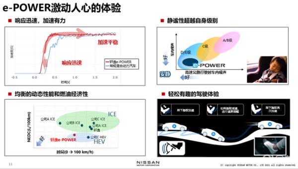 最后是關(guān)于燃油經(jīng)濟性的內(nèi)容。左下圖中縱軸是NEDC的工況,越往下越佳。橫軸是百公里加速時間,越往左代表時間越短,時間越短證明動力越充沛。e-POWER在紅點,一般的混合動力車型是右側(cè)的藍點。從這個圖可以看出,在燃油經(jīng)濟性上e-POWER與傳統(tǒng)的混合動力車稍微有一點區(qū)別,但是在動力性能方面,e-POWER百公里加速有明顯的優(yōu)勢。與上面綠圈區(qū)域的傳統(tǒng)燃油車相比,燃油經(jīng)濟性是有明顯的改善,同時也沒有放棄燃油車的駕駛樂趣,給消費者提供了燃油車的駕駛體驗,e-POWER動力系統(tǒng)在動態(tài)性能和燃油經(jīng)濟性間取得了平衡。