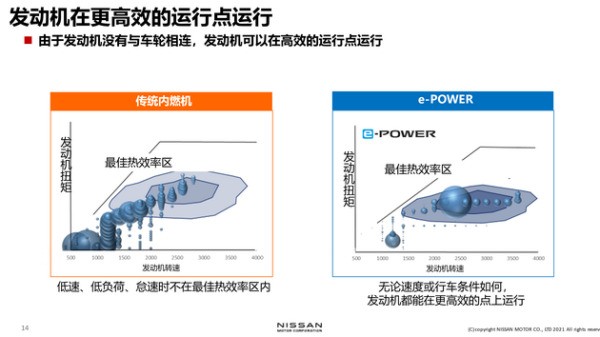 首先明確一下,這兩張圖都是基于WLTC的工況標準,得到的數(shù)據(jù)結(jié)果。各個點的大小代表著在這一個轉(zhuǎn)速和扭矩的情況下,發(fā)動機介入的時間長短。和小點相比大點表示在這個區(qū)域的時間會比較長。對于傳統(tǒng)內(nèi)燃機,雖然中間區(qū)域是最佳熱效率區(qū),但是由于它的發(fā)動機和車輪是直接連接的,速度時快時慢,因此在時間分布上并不全在最佳區(qū)域里,在左下角區(qū)域是比較集中的。而e-POWER的發(fā)動機沒有與車輪相連,所以即便是在車輛低速或者停止的時候,也不會對發(fā)動機工況造成影響,所以我們看到左下角這里e-POWER比傳統(tǒng)內(nèi)燃機要相對少了很多的點。因為發(fā)動機和車輪轉(zhuǎn)速沒有關(guān)系,能夠讓發(fā)動機保持在最佳工作區(qū)域里。基于以上的考慮,如果我們繼續(xù)提高發(fā)動機的效率,然后把效率更高的發(fā)動機控制在最佳熱效率區(qū)運行,那么將來對碳減排將很有幫助,這是e-POWER技術(shù)上的未來性。發(fā)動機的未來發(fā)展,對于e-POWER技術(shù)的發(fā)展也是有相互補充作用的。