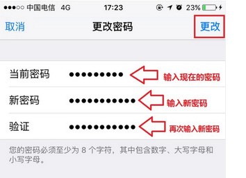 10、根據提示,依次輸入舊密碼和新密碼,新密碼要輸入兩次以確保密碼的正確,點擊右上角的“更改”。