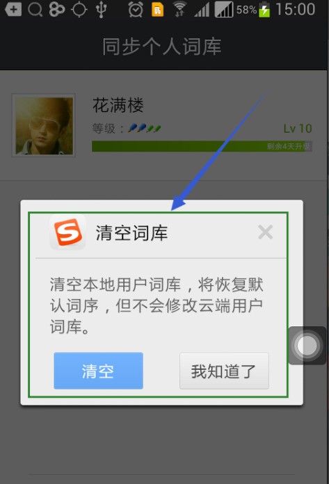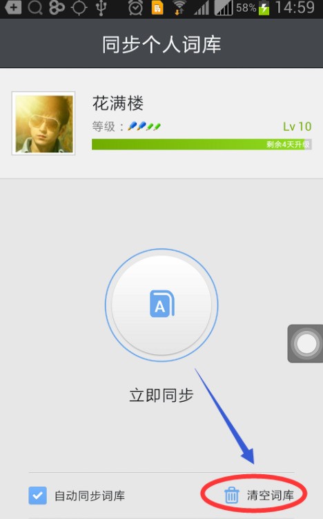 6,在新的“同步個人詞庫”頁面下,我們可以同步手機和電腦的詞庫,然后在該頁面的右下側有一個“清空詞庫”選項,點擊之后就會清除之前所有的系統記憶掌鎮陽市把詞庫,詞序恢復到了默認狀態。