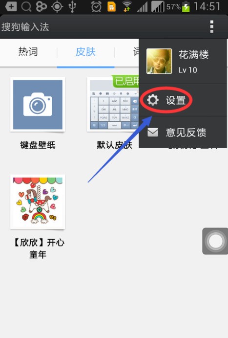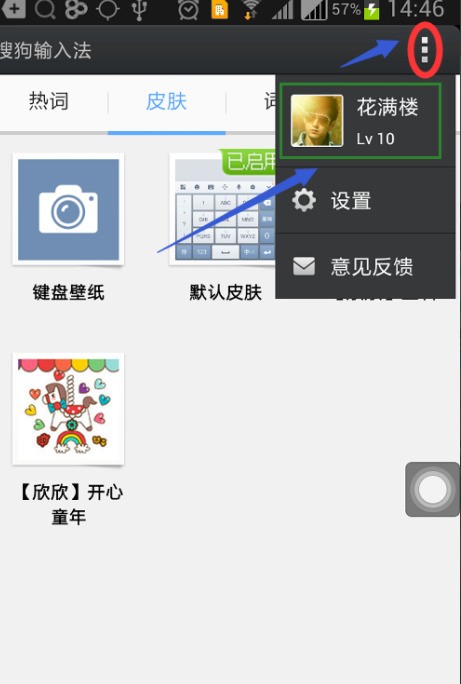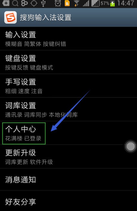 2,之后使用自己的搜狗賬號登錄,可以在設置頁的“個人中心”里點擊登錄,登錄以后在輸入法的首頁右上角下拉選項里看到我們的個人頭像,如圖;在這里筆者要強調一點,必須是登錄賬戶才能進行記憶詞庫的同步、清除等功能。