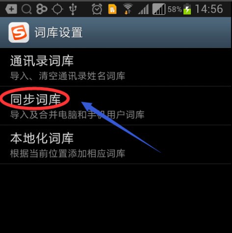 5,然后在該設置下有三個選項,分別是通訊錄詞庫、同步詞庫以及本地化詞庫,我們點擊中間的“同步詞庫”。