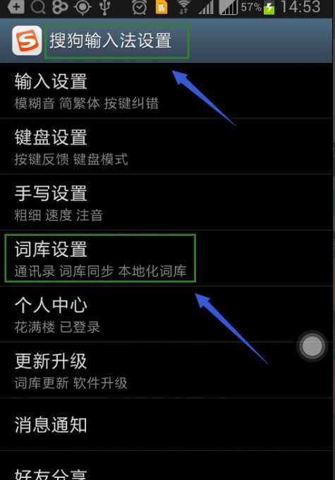 4,接著就會跳轉到“搜狗輸入法設置”頁面,從下圖我們可以看到有很多設置項,其中有一項“詞庫設置”,找到該項然后點擊。