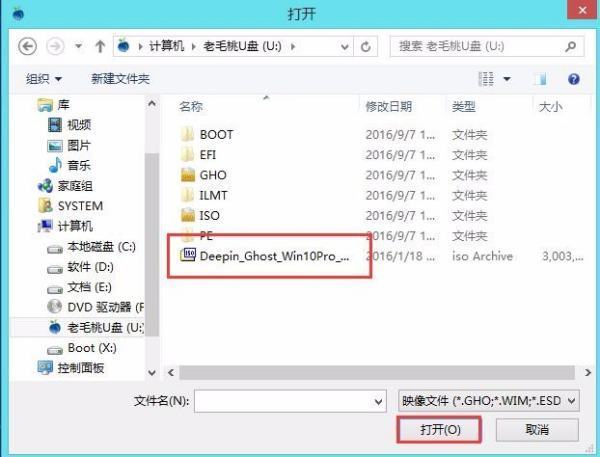 3、接著找到并袁音農因選中u盤啟動盤中的win10系統iso鏡像文件,點擊“打開”即可,如下圖所示: