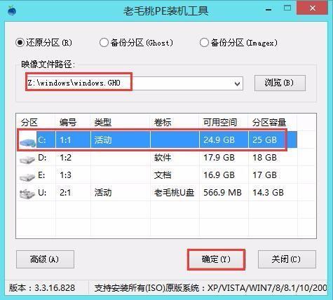 4、映像文件添加成功后,在分區列表中選擇C盤作為系統盤,然后點擊“確定”即可,滿修由突肥驗損紹驗怕如下圖所示: