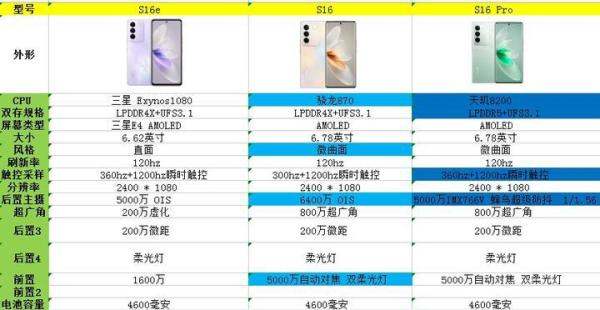 一、價格與定位vivo S16E:價格最低,8+128G版本2099元起,適合預算有限或對性能要求不高的用戶。vivo S16:中端定位,8+128G版本2499元起,兼顧性能與自拍,適合多數主流用戶。vivo S16 Pro:旗艦定位,8+256G版本2999元起,性能與拍照全面升級,適合追求極致體驗的用戶。